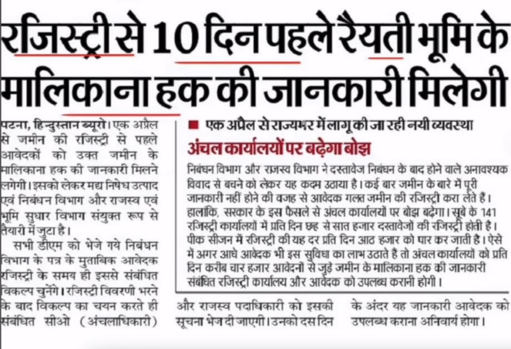 बिहार जमीन रजिस्ट्री नया नियम 2026:-बिहार में जमीन खरीदने वालों के लिए एक बहुत बड़ी अपडेट निकल कर आ रही है। राज्य सरकार 1 अप्रैल 2026 से जमीन रजिस्ट्री की प्रक्रिया में एक क्रांतिकारी बदलाव करने जा रही है। अब जमीन लिखवाने से पहले सरकार खुद आपको बताएगी कि उस जमीन का असली मालिक कौन है और उस पर कोई विवाद तो नहीं है।